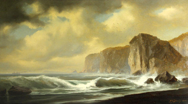 Gideon Jacques Denny (1830-1886) cultivated a love for the sea and the beauty it offered at an early age. Born in Delaware, Denny frequently sailed the Chesapeake Bay as a young man before heading to San Francisco during the Gold Rush of 1849. His passion for art and drive to create eventually led to an apprenticeship in Milwaukee with Samuel Marsden Brookes, a still life painter with whom Denny would have a lifelong friendship. Denny and Brookes moved together to San Francisco six years later and set up a small studio on Bush Street. By the end of his life, Denny had become the most coveted maritime and seascape painter in San Francisco. Collectors had come to admire the artist’s penchant for displaying ships in distress and his talent for capturing nature. In addition to his fame as an artist, Denny served as the first director of the San Francisco Art Association and was active in the Bohemian Club, Pacific Union Club, and Society of Californian Pioneers.