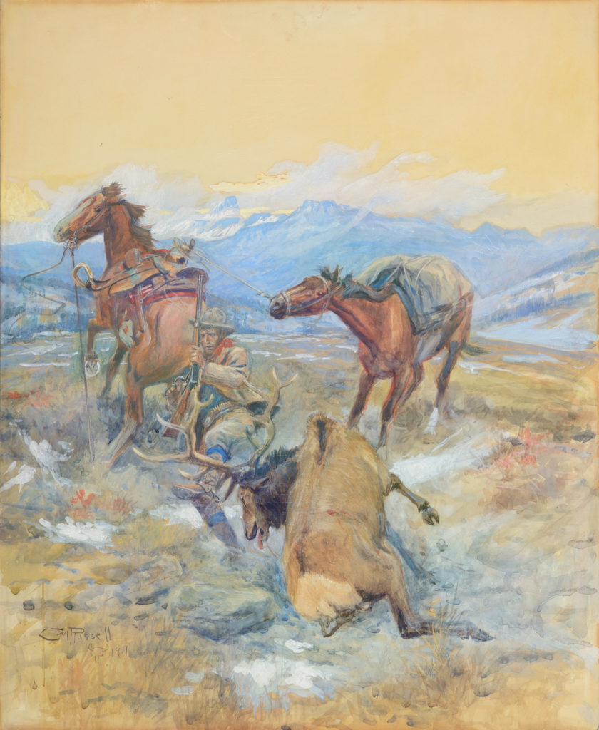 Museum-quality paintings will cross the block, headlined by a pair of masterpieces by Frederic Remington and Charles M. Russell. “Casuals on the Range” is a rare oil by Remington, and Russell’s “Creased” is a prime 1911 watercolor. Both come from the estate of John J. “Jack” Mitchell, a renowned collector and co-founder of United Airlines. Mitchell began collecting in the 1930s and amassed a fine collection of Western art. Both paintings are fresh to the market and carry presale estimates of $800,000–$1,200,000.