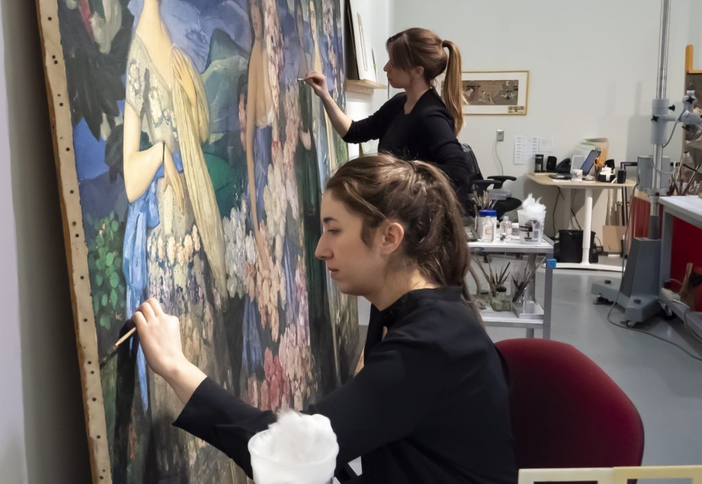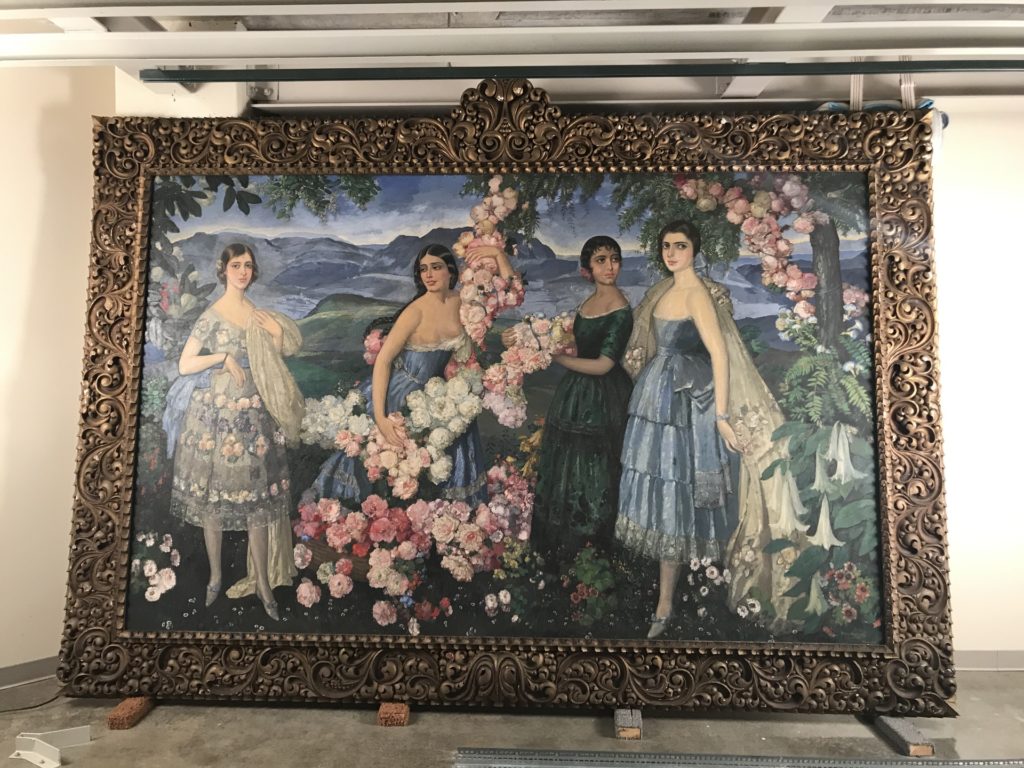 The painting is the breathtaking focal point of “Flores Mexicanas: A Lindbergh Love Story,” a 2,000-square-foot special exhibit at the Missouri History Museum located in St. Louis’s Forest Park. Prior to filling its starring role in the exhibit, “Flores Mexicanas” was in need of conservation so that it could be displayed in its near original splendor and to ensure it could safely hang in the gallery.