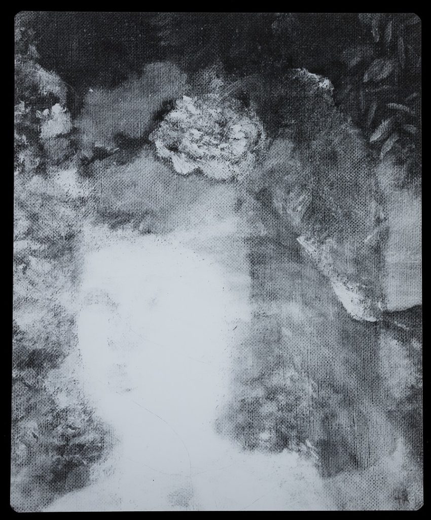The first step in the conservation process was to x-ray Martinez’s masterpiece at the Missouri Historical Society Library and Research Center. This normal step in the conservation process revealed a surprising discovery. As the equipment was being calibrated, an image was taken of the upper-right portion of the canvas, revealing a woman who had been painted over. This provides evidence that a compositional change had taken place. A search through the Missouri Historical Society’s Photographs and Prints Collection uncovered a picture taken of “Flores Mexicanas” in the mid-to-late 1930s. Comparing the painting to the old photograph confirmed that the woman had already been painted over by the time it came to the Missouri Historical Society (MHS). No one knows for sure if Ramos Martinez decided to paint over this figure or if he moved it to a different place on the canvas.